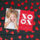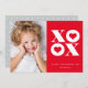 This modern photo valentine's day card features bold white xoxo with hearts in the o's on a red background.