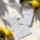 A fresh and elegant lemon wedding menu card featuring a soft blue palette with citrus-inspired details. The clean layout paired with handwritten script typography creates a light Mediterranean feel, perfect for summer weddings and destination celebrations.