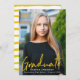 Stylish, modern graduation announcement featuring the graduate's vertical photo with "Graduate" in a yellow brush script font. Personalise the photo graduation announcement by adding the graduate's name, school name, and graduation year. The trendy graduation announcement reverses to display a yellow and white striped pattern.