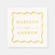 Add a stylish touch to your wedding reception, rehearsal dinner, engagement party, or wedding shower with these Modern Yellow Wavy Frame wedding napkins. The retro wedding napkins display the couple's names in bold yellow lettering surrounded by a yellow wavy border contrasting with a white background. The trendy wedding napkins were designed to coordinate with our Modern Wavy Frame wedding collection.