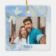 Modern yet Elegant Blue Gold Swirl pattern with Dragonflies Christmas holiday ornaments for your favourite photo on the front along with the year,
