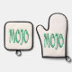 Mojo silver-quilted oven mitts pot holder sets are for mojo cooks, chefs, and bakers who create that special magic in the kitchen or on the grill. Mojo is Steamy Raimon original calligraphy art.