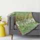 A quality printed throw has its advantages. This is a much finer weave throw than its loopier cousins, and though lighter, it is worth the investment for custom room accessorizing. The back is much prettier than the typical brown, and the fringe on the long sides very vivid, the selvage nicely done. Before photographing, I washed the throw in cold water, delicate, with a thicker woven throw the same size. On tumble dry low, this throw was dry in half the time as the other. This is a very practical quality if you use throws for furniture covers or to wrap up in frequently. The sleekness of the fabric makes it a great layer for accenting or protecting without the feeling of sitting on too much stuff. Perfect for napping or when you feel a light chill coming on. The color printing is beautiful and on this fabric, matched the design and color of my Photoshop image. This is an advantage for blending room fabrics and colors. The fringe on the short sides prints the colors from the design image and therefore varies from the side fringe. I streaked a white fractal line through the plaid pattern to give the illusion of weaving. This printed as crisp as an illusory thread, and put some white in the short side fringe, showing another advantage of print vs loomed- for artistic purposes, line lines, detail, and color integrity can be planned and preserved. My loomed throws have color limitations and more of a needlepoint texture. Print throws reproduce an exact image. The throw felt a little stiff straight out of the package, but this went away in the first delicate wash. Of course I searched the wash water for ink or bleeding and there was none.