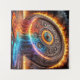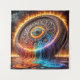 A massive, intricately detailed circular clock melts under intense flames, its hands and numbers liquefying into vibrant streams of molten crimson, neon violet, and glowing turquoise. The surreal rivers of molten colours pool at the base, resembling liquid gems in a fiery and smouldering landscape. The dark, atmospheric scene brings an intense and surreal twist to the concept of time, perfect for lovers of bold, abstract art with a fiery touch.