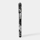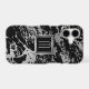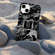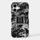 This unique phone case features your monogram in silver on a square black banner with a double silver frame. The banner is placed on an interesting background that looks as if molten silver has been randomly poured upon black, forming an abstract pattern. Beautiful!