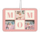 Give Mom a gift she'll cherish. This photo collage car air freshener features three of her favorite square family photos, along with the chunky pink letters "M-O-M" in alternating white squares on a pink background. An ideal gift for Mother's Day, Mom's birthday or other special occasions.