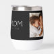Mom Established Typography Black Photo Design - Give Mom the recognition she deserves with this fun black and white photo wine tumbler. The word "MOM" appears in classic white typography on a black background, with the words "EST." ("Established") and the year below. Easily replace the sample photo with your favorite mom and baby photo. Edit the text to display one or more birth dates. Other short variants of "mom," such as "mum" or "mama," can be substituted. Makes a great gift for Mother's Day or Mom's birthday!
