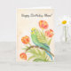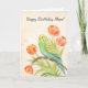 Parakeet tulip watercolor birthday card for mom featuring a delicate hand painted budgie perched among soft blooming tulips on a warm, peaceful background. Created with gentle color and botanical detail, this elegant design offers a heartfelt and calming way to celebrate your mom on her special day.