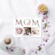Mother's Day card with the word MOM in real silver foil typography and pink roses. It has the word "MOM" in a decorative relief font in silver foil, pink rose bouquets, and three photos. The backside has a grey pattern of the word "MOM." Some photos are courtesy of Storytree Studios, Stanford, CA.