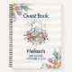 A baby shower guest book. Peach and white striped pattern. With a digital illustration made with watercolors - a cute bunny rabbit wearing a blue dress sitting in a basket surrounded by her eggs. Butterflies flutter around the basket which is decorated with a fancy flower bouquet. Pink and blue tulip flower arrangements in the corners.
