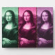 Da Vinci's masterpiece times three (x3), set off in colours of green, raspberry, and plum purple... with thin vertical streamers of animal print.