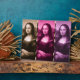Da Vinci's masterpiece times three (x3), set off in colours of chocolate brown, raspberry, and plum purple... with thin vertical streamers of animal print.