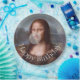 Mona Lisa blowing gray bubble gum with Happy birthday greeting