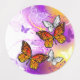Orange, detailed monarch butterflies on light, purple, picturesque, painted background.