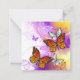 Orange, detailed monarch butterflies on light, purple, picturesque, painted background.