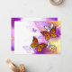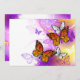 Orange, detailed monarch butterflies on light, purple, picturesque, painted background.