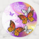 Orange, detailed monarch butterflies on light, purple, picturesque, painted background.