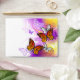 Orange, detailed monarch butterflies on light, purple, picturesque, painted background.