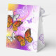Orange, detailed monarch butterflies on light, purple, picturesque, painted background.