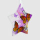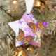 Orange, detailed monarch butterflies on light, purple, picturesque, painted background.