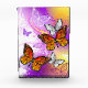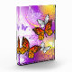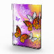 Orange, detailed monarch butterflies on light, purple, picturesque, painted background.