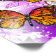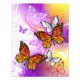 Orange, detailed monarch butterflies on light, purple, picturesque, painted background.
