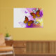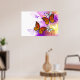 Orange, detailed monarch butterflies on light, purple, picturesque, painted background.
