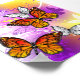 Orange, detailed monarch butterflies on light, purple, picturesque, painted background.