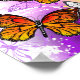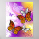 Orange, detailed monarch butterflies on light, purple, picturesque, painted background.