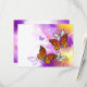 Orange, detailed monarch butterflies on light, purple, picturesque, painted background.