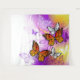Orange, detailed monarch butterflies on light, purple, picturesque, painted background.