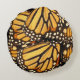 This decorative round throw pillow features an abstract pattern of a lovely Monarch Butterfly (Danaus plexippus) wing in colours of orange, yellow, gold, black, brown and white.