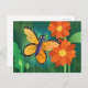A brightly coloured monarch butterfly flutters amongst the red daisies. Original illustration by Noël Snow.