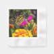 Beautiful newly born Monarch Butterfly resting on a pink marigold. Lovely photo of Spring on paper napkins. Copyright photo by Debra Carr