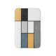 Abstract modern art with colourful (navy blue, grey, black, yellow, white) rectangles in Mondrian style on white background