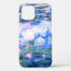 A Monet pink water lilies iPhone 12 case featuring beautiful pink water lilies floating in a calm blue pond with lily pads. A great Monet gift for fans of impressionism and French art. Serene nature impressionism with lovely flowers and scenic pond landscape.