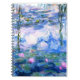 A Monet pink water lilies spiral notebook featuring beautiful pink water lilies floating in a calm blue pond with lily pads. A great Monet gift for fans of impressionism and French art. Serene nature impressionism with lovely flowers and scenic pond landscape.