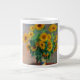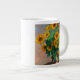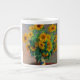 Coffee Mug featuring Claude Monet’s oil painting Bouquet of Sunflowers (1881). Beautiful sunflowers in a blue vase atop a red table. A great gift for fans of impressionism and French art.