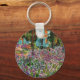 A Monet flower keychain featuring beautiful pink and purple irises in a garden shimmering underneath tall trees. A great Monet gift for fans of impressionism and French art. Peaceful nature impressionism with lovely flowers and scenic landscape.