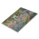 A Monet flower notepad featuring beautiful pink and purple irises in a garden shimmering underneath tall trees. A great Monet gift for fans of impressionism and French art. Peaceful nature impressionism with lovely flowers and scenic landscape.