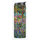 A Monet flower thermal tumbler featuring beautiful pink and purple irises in a garden shimmering underneath tall trees. A great Monet gift for fans of impressionism and French art. Peaceful nature impressionism with lovely flowers and scenic landscape.