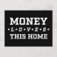 Three rows of big bold uppercase letters that read "MONEY LOVES THIS HOME", with uplifting and affirming plus signs decorating the word "LOVES". The artwork is white in colour. The background colour is transparent and customisable.