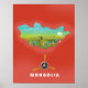 Mongolian illustrated map, landscape and prop plane blade vacation tourist poster against a vivid red background.