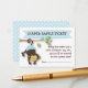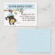 A fun game for you to include in the baby shower invitation that welcomes guests to be entered into a raffle, if they bring a package of diapers along with them to the baby shower. Cute little monkey baby in a pair of blue diapers hangs playfully from a flowering branch. Pastel baby blue and white colour scheme will coordinate with just about any baby boy shower invitation too.