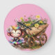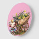A delightful monkey ballerina, adorned in a rainbow tutu with matching rainbow-colored hair, poses elegantly before a wooden wheelbarrow brimming with vividly colored flowers.