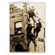 Men posing for a picture on a telephone pole in front of some female admirers.