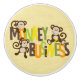 Bright and colourful typography features whimsical monkeys with "monkey business" text in green, brown, orange and yellow. Background is pale yellow linen / burlap look texture. Great accent for kids room or nursery