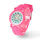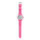 A watch with a cute cartoon illustration of a funny brown monkey sitting down. She has pink blushing cheeks for additional kawaii cuteness. texture. Fun and whimsical design. The background is a blue chevron pattern. Personalise with a name. The clock face numbers are big and bold for easy reading.