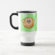 A monkey face cartoon on a green dotty pattern. A cute animal image.