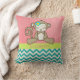 A personalised pillow with a cute cartoon illustration of an adorable brown monkey sitting down. She has pink blushing cheeks for additional kawaii cuteness. She also has a little blue flower in her hair. Fun and whimsical design. Set on a combination pink shabby texture and blue green chevrons. Personalise with your name or other text on a lime green border.
